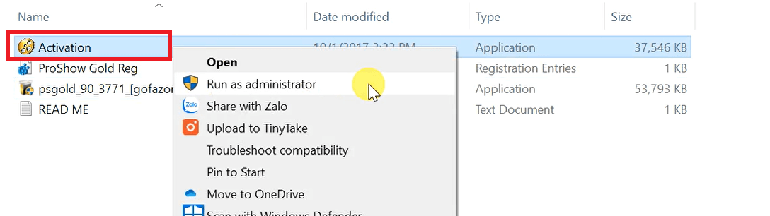 Quay lại thư mục đã tải về, chạy file Activation với quyền admin.