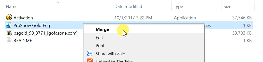 Nhấp chuột phải vào file ProShow Gold Reg, chọn Merge. Nếu máy bạn không có tùy chọn Merge thì bạn có thể nhấp đúp vào để mở file này bình thường nhé.