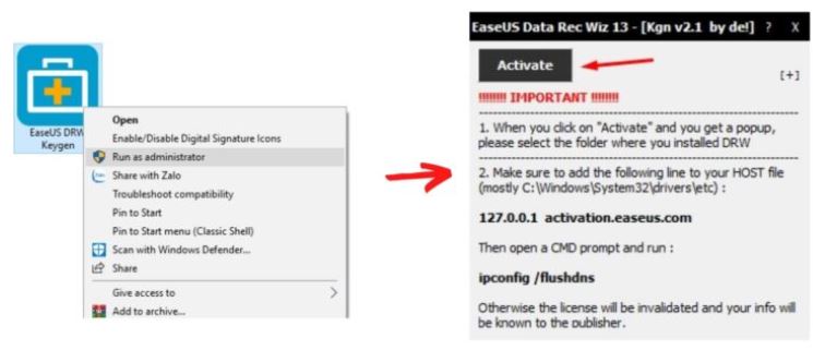 Bước 1: Trở về tệp RAR tải về ban đầu, extract file có tên là EaseUS DRW ...eygen.exe và chạy ở chế độ Run as adminitration.
