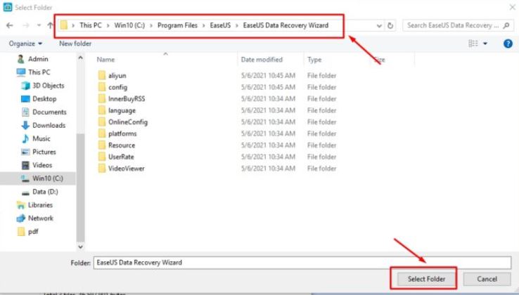 Bước 2: Ở cửa sổ Slecect Folder, đi tới thư mục cài đặt gốc theo đường link C:\Program Files\EaseUS\EaseUS Data Recovery Wizard (mặc định) > Select Folder.