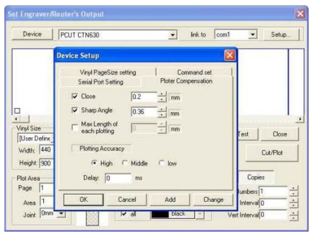 Trong thẻ Plotter Compensation => Chọn Close (khép góc) >= 0.2 mm và Sharp Angle (góc vuông) >= 0.36mm.
