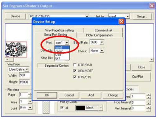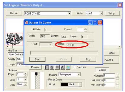Chọn Start => trên dòng Status xuất hiện: => Chọn lại cổng COM cho máy cắt như hình dưới là được.