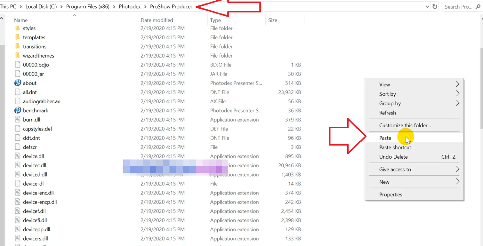 Hãy vào thư mục cài đặt của phần mềm ProShow Producer 9.0 ở ổ C theo đường dẫn vòng đỏ bên dưới. Khi vào thư mục đó rồi thì nhấp chuột phải vào một vùng trống rồi chọn Paste để chép 3 file đã copy ở trên vào đây.