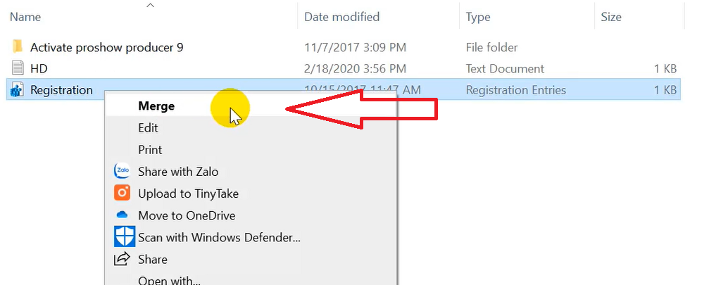 Vào lại thư mục tải về lúc nãy, nhấp chuột phải vào file Registration như hình bên dưới rồi chọn Merge. Máy tính nào không có Merge thì bạn nhấp đúp vào file để mở nhé.